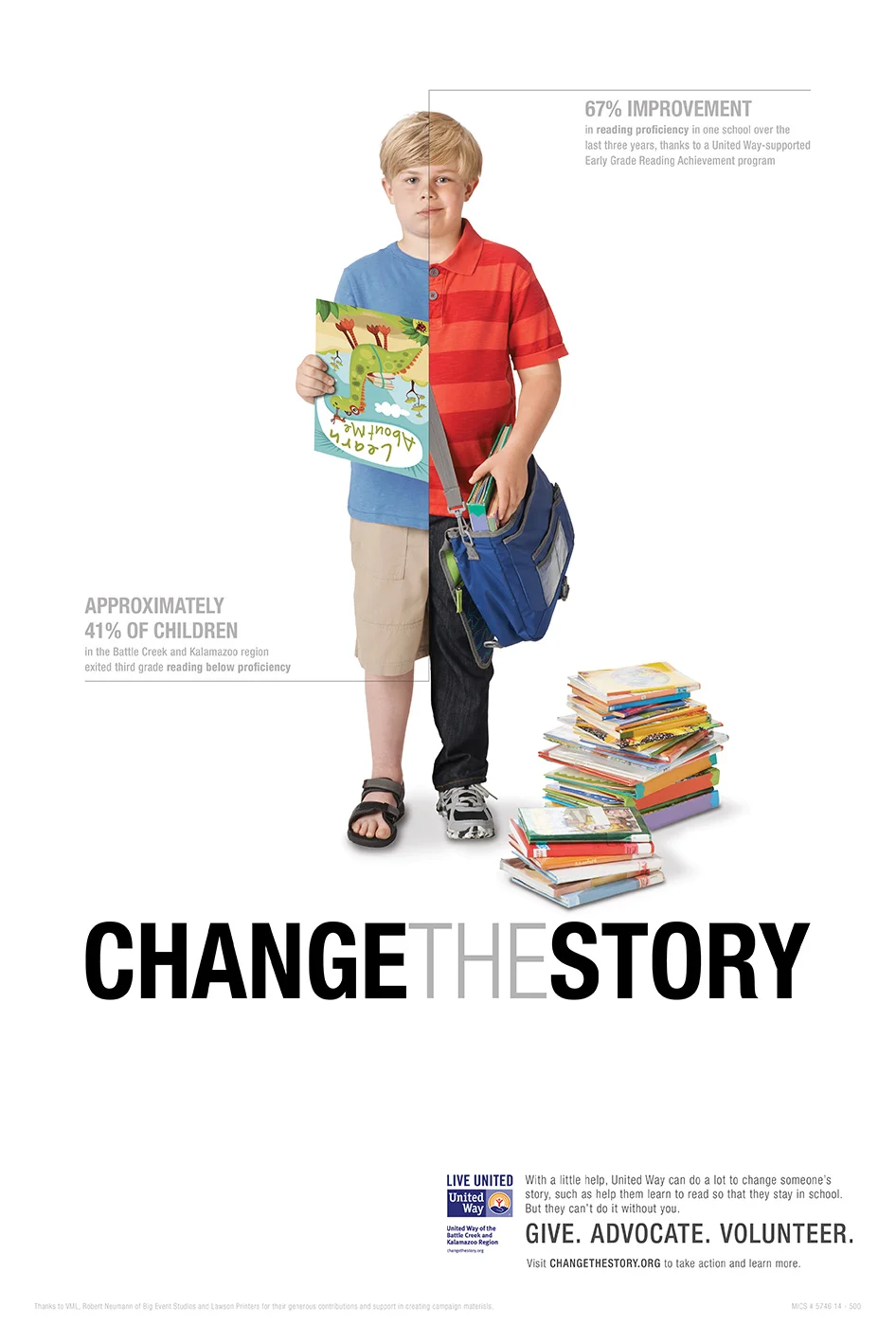 Strategically, we focused on their core narrative: “changing the story.” Our creative solution was to visually depict transformation, showing the before and after of lives improved through United Way’s programs in education, income, and health.